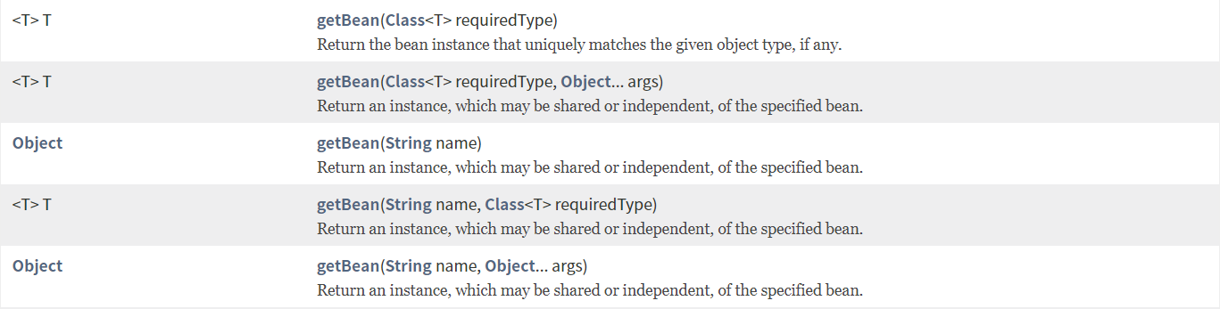 Figure 1. getBean() 메소드 [Figure 1]은 공식 API 문서에서 getBean() 메소드를 검색한 결과이다. 상위 인터페이스인 BeanFactory 문서에 있다.